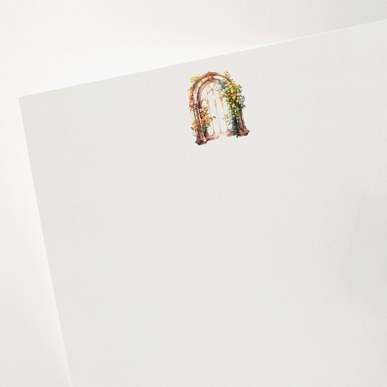 Introducing our exquisite letter sheet, where elegance meets nature in a stunning display of artistry. Crafted with meticulous attention to detail, our digitally printed image captures the timeless beauty of this picturesque window, inviting you to embark on a journey of imagination and creativity with every stroke of your pen. Whether you're writing heartfelt correspondence or expressing your artistic flair, this letter sheet provides the perfect canvas for your thoughts to bloom and flourish. Elevate your stationery wardrobe and make a lasting impression with our Arched Window Half Sheet – where inspiration knows no bounds. Included envelopes are lined in rose gold.